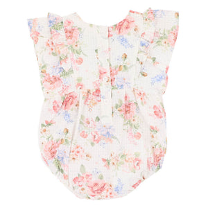 Soft, sweet, and beautifully detailed, the Anya Woven Bodysuit is a charming choice for special moments or everyday elegance. Crafted from lightweight, breathable cotton, it features a vintage-inspired bloom print in delicate pinks, corals, and blues on an ivory base. The flutter sleeves with soft ruffle detail and gently gathered bodice create a timeless silhouette, while snap leg openings and a back button closure make dressing easy.