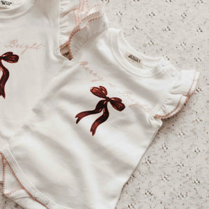 Merry & Bright Bodysuit features cute flutter sleeves and snap clips on bodysuit for easy nappy change.