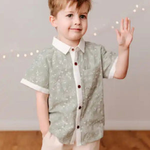 Boys collared dress shirt in embroidered holly print from the Bencer and Hazelnut Christmas Collection.  Features collar, button down front and front pocket.