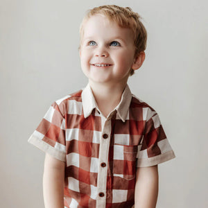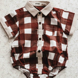 Boys collared dress shirt in gingham print from the Bencer and Hazelnut Christmas Collection. Features collar, button down front and front pocket. Shirt Romper features snap clip for easy nappy change.