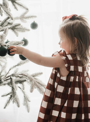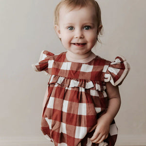 Beautiful red gingham dress with frill on the bodice and shoulder frill. Playsuit features snap clips for easy nappy change.