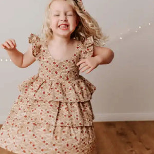 Beautiful poinsettia floral print dress with shoulder frill and layered skirt.  Playsuit features snap clips for easy nappy change.