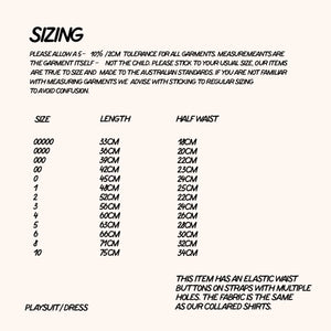 Sizes  0000 - 1 [Playsuit] and 2 - 6 [Dress]