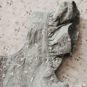 Beautiful Holly embroidered dress with shoulder frill and layered skirt .   Playsuit features snap clips for easy nappy change.