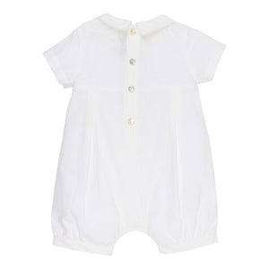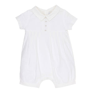 This short sleeve romper features a collar, pin tuck mock button front, and a concealed press stud opening. Perfect for special occasions including wedding, christening or naming day ceremony.