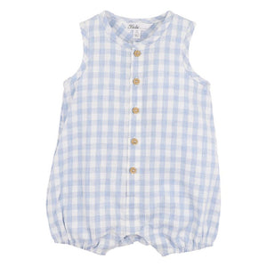 A timeless summer staple, our Axel Check Romper is crafted from soft, breathable cotton in a fresh blue gingham check. This sleeveless design features classic wooden-look buttons down the front and gently elasticated leg openings for all-day comfort. With concealed press studs at the crotch for easy nappy changes, it's both practical and charming. Perfect for sunny adventures or special outings.