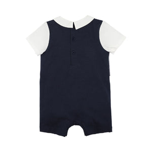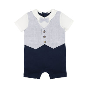 This short sleeve gentleman romper features a collared shirt with bowtie, three•button contrast waistcoat, a knit back with button opening and a concealed press stud crotch opening. The perfect all in one outfit for any special occasion.