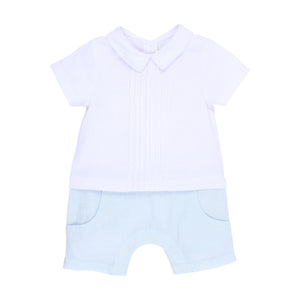 This short sleeve romper features an ivory pin tuck shirt with a collar, back buttons.  The attached pale blue pants have functional pockets and a press stud closure. Perfect for special occasions.