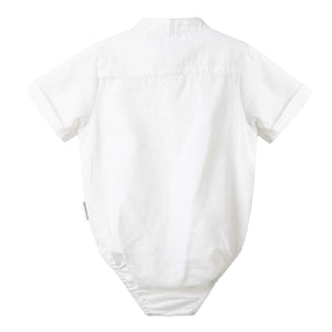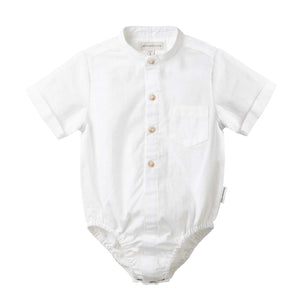 The Leo S/S Button Romper features a tailored standing collar, short sleeves with rolled up cuffs, front button openings, front pocket and a snap button closure at the gusset. Can be paired with the Finley Linen Shorts or Pants for the perfect special occasion look for your little man.