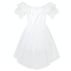 The Camille Lace Dress is the perfect boho inspired special occasion dress this season. Featuring soft and delicate lace, matching tulle skirt and off the shoulder lace detail, your girl will look gorgeous at her next party or wedding. Please note: belt and flower crown pictured not included.