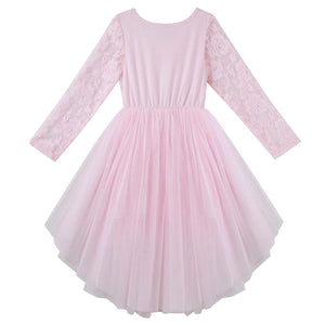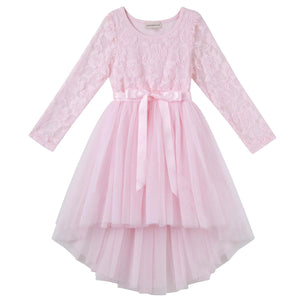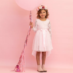 The Candi Lace Tutu Dress features a gorgeous long sleeve rose lace bodice with a tulle tutu skirt that dips at the back. Perfect for a flower girl, party wear or any special occasion.