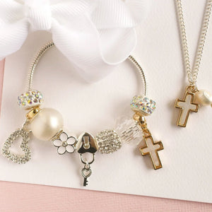 A combination of sweetness and elegance, our cross charm bracelet is classic by design and exudes charm and innocence. Silver, white, and gold are a perfect fit for a special occasion, whether for a baptism, First Communion, or just for everyday wear. This charm bracelet will undoubtedly become a special keepsake for whoever owns it, particularly because of the beautiful mother of pearl cross charm included.