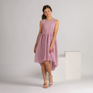The ultimate Boho beauty! Beautiful dress features lace detailed bodice with a mid length soft tulle skirt that dips at the back.  Fully lined.