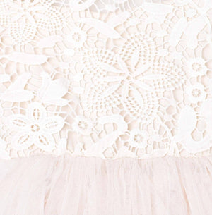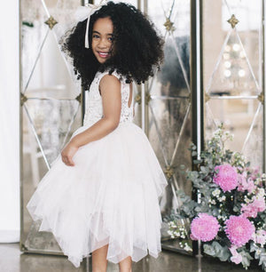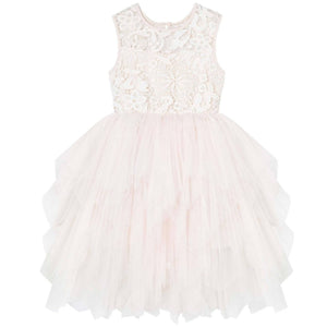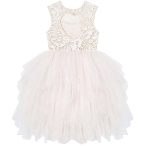 The gorgeous Tara Heart Back Dress features floral lace bodice, several layers of flowing tiered tulle and a beautiful heart back cut out on the back. The perfect dress for your princess's next wedding, birthday party or special occasion! Size Range: 3 - 12 Colour: Beige Style: DKD1015 Material: Lace & Lining - 100% Cotton | Skirt - 100% Polyester