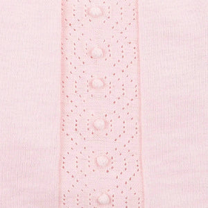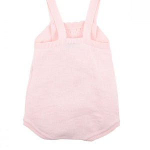 This gorgeous pink knitted bodysuit features a pointelle design down the front with knitted baubles, adjustable button straps and press stud crotch opening. Perfect for newborn photos, naming day or special occasion.