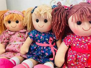 Soft body doll with removable clothing features wool strand hair, embroidered face and button eyes.  Machine Washable.