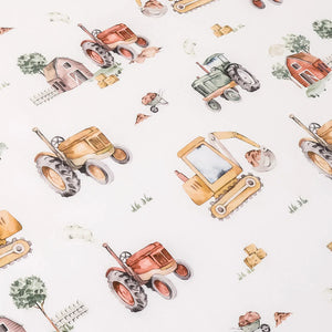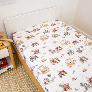 Snuggle Hunny's fitted bed sheets are made from our signature organic jersey cotton - snuggly soft and certified organic! Available in a range of our popular hand-painted prints, including Diggers & Tractors.