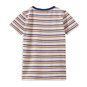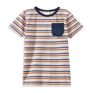 Milky Clothing Mini Stripe Pocket Tee. Add some style to your little ones summer wardrobe with this cool short sleeve t-shirt! Featuring a comfortable fit, it keeps him looking sharp and feeling great all day. With horizontal stripes in tan, navy, and oatmeal, plus a navy rib neckline and pocket, it's both stylish and versatile. Available in sizes up to 7, this tee ensures a perfect fit for your growing child.