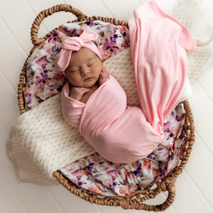 Our Snuggle Hunny organic cotton jersey wrap with matching topknot is soft, snuggly and stretches with baby. This wrap features our exclusive Snuggle Hunny Bubblegum and is made with GOTS Certified Organic cotton