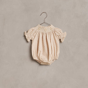 A unique smocked neckline adorns this vintage inspired romper designed to perfectly match our Maddie dress. It has vintage swiss dot textured fabric and button back closure. Perfect for family photos, christening or naming day ceremony, wedding or any special occasion.