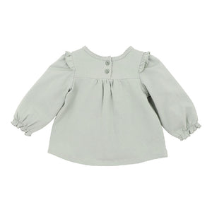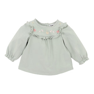This sweet top is the perfect addition to your little ones winter wardrobe. Featuring a gorgeous floral embroidery on the front bodice and frill around the yoke, this top has elasticated cuffs and a button back opening for ease of dressing your little one.