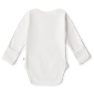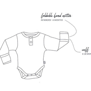 For newborn to 6 months, these baby bodysuits include foldable hand mittens. Hand mittens help stop little nails from scratching as well as keep hands warm in cool weather. Bub can wear the mittens open or closed. Sizes 6 to 18 months boast a stylish cuff.