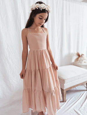Made from the finest quality french chiffon in a beautiful on trend blush pink, this stunning maxi dress will be a favourite no matter the occasion. With an A-line silhouette featuring a stunning laced back and a tiered maxi skirt, this is a dress for all girls to love and enjoy swirling and dancing at her primary school graduation. Chic, elegant and super comfortable with luxurious chiffon, we can't say enough about our love for this new style.